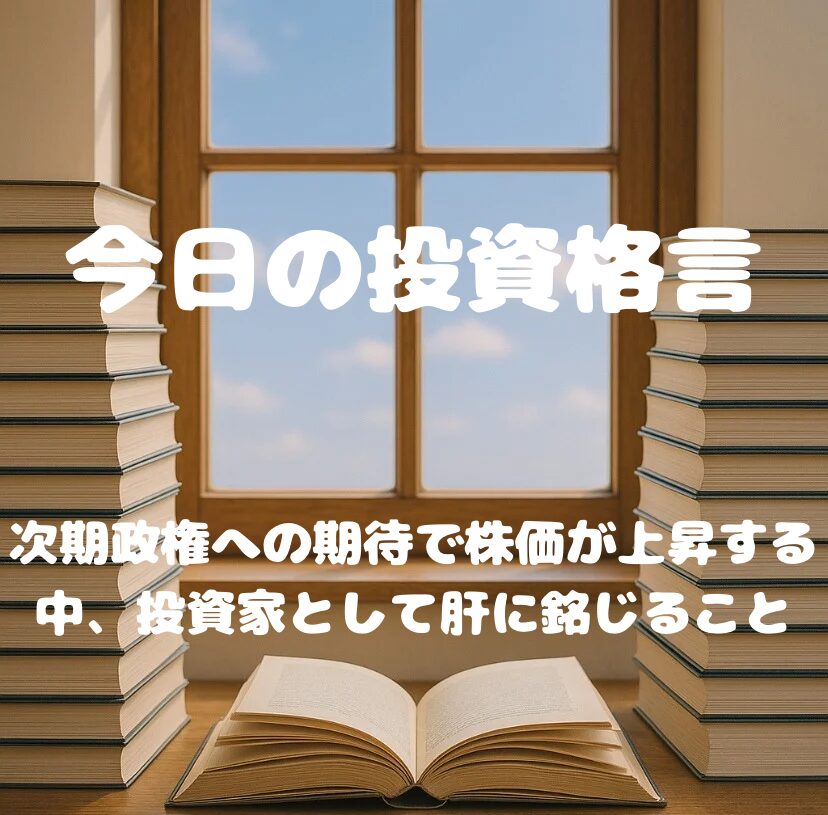 投資の格言 【投資格言】今日の気になる格言|次期政権への期待で株価が上昇する中、投資家として肝に銘じること 9月9日の東京株式市場は、日経平均株価が続伸し、取引時間中として過去最高値の4万4000円を上回る状況になりました日本経済新聞によると、この株価上昇は、『石破茂首相の退陣表明を受け、次期政権が大規模な経済対策を打つとの思惑から、海外投資家の... 2025.09.09 投資の格言雑記と投資日記