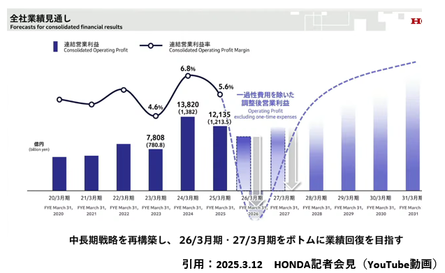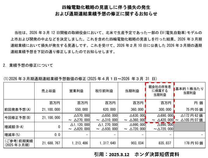 今期(26年3月期)、ホンダは当期利益を3,000億円の黒字としていたところ、一転して4,200~6,900億円の赤字に転落する見通しを発表(3月12日付、適時開示)